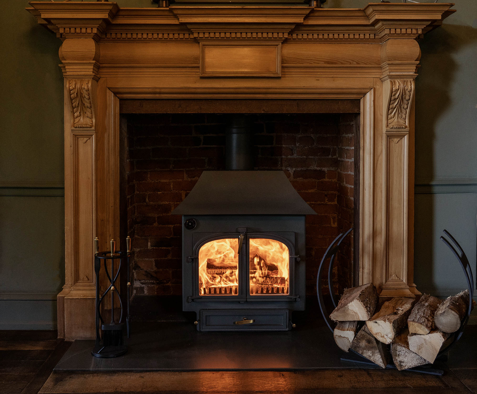 - Supplied with four practical tools - shovel, brush, poker, and tongs.