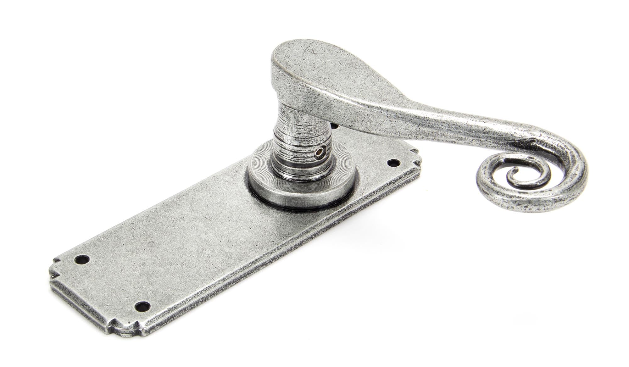Our talented Blacksmiths heat and delicately hammer a thin piece of mild steel to form the curly, Monkeytail shape of this lever handle. One of our most traditional designs.