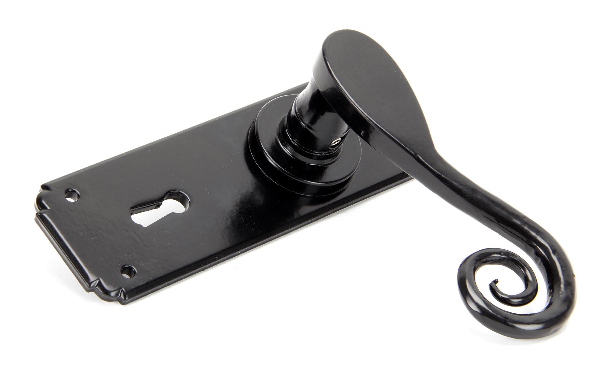 Our talented Blacksmiths heat and delicately hammer a thin piece of mild steel to form the curly, Monkeytail shape of this lever handle. One of our most traditional designs.